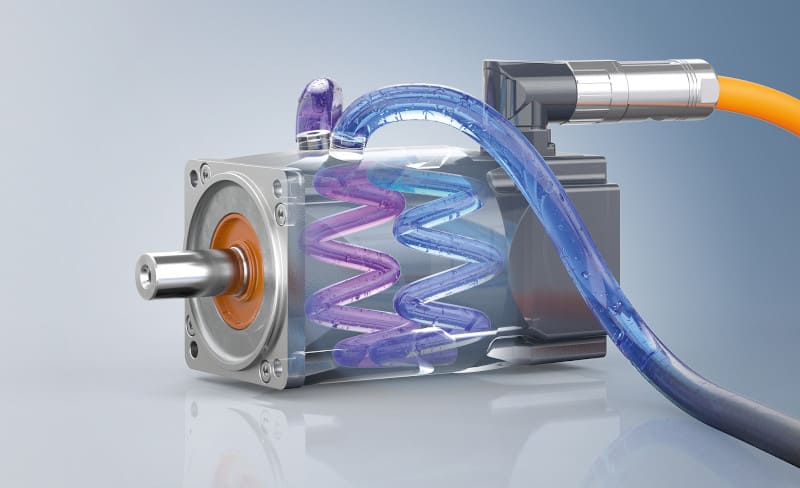 Depending on the size, they are available with various feedback systems such as resolvers or batteryless single and multiturn encoders with One Cable Technology (OCT) or Hiperface. With its water cooling system and high IP65 protection rating, the AM8300 is also suitable for demanding environmental conditions – particularly those with high ambient temperatures. Depending on the size, the AM8300 is equipped with a 1/8” or 1/4” thread for connecting the cooling circuit.