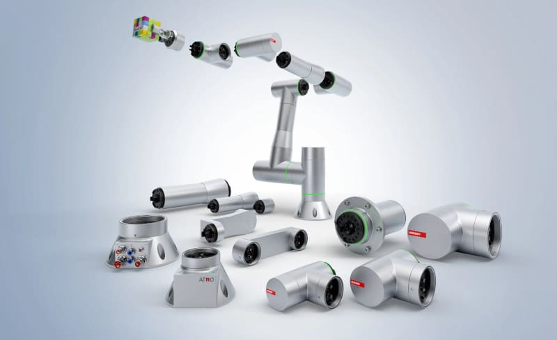 The ATRO modular industrial robot system enables the creation of optimal robot setups tailored to various assembly and handling tasks in a personalized and adaptable manner. Standardized motor modules featuring built-in drive capability, along with link modules available in multiple designs and lengths, enable nearly endless mechanical combinations. Complete integration with TwinCAT, the extensive Beckhoff control platform, also grants immediate access to a variety of established automation features – encompassing everything from machine control, robot control, safety, vision, condition monitoring, to links with edge devices or cloud systems.