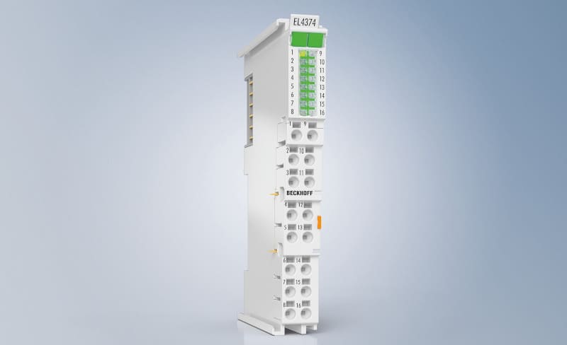 The EL4374 is a powerful combined input/output terminal for 10 V/20 mA that can be used for standard automation tasks at a conversion rate of 1 ksps per channel. The analog inputs are digitized with a resolution of 16 bits and transmitted to the higher-level automation device under galvanic isolation. The 16-bit resolving outputs have the same properties.