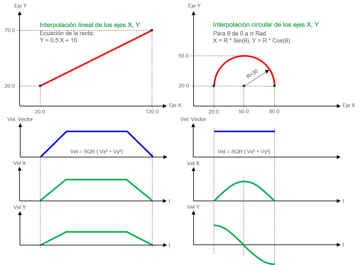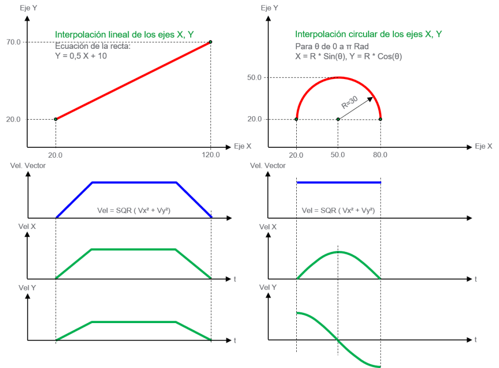 In the case of linear interpolation, the X, Y coordinates in 2D, or X, Y, Z coordinates in 3D of the target position must be indicated. In the case of circular interpolation, it is most common to define the arc of the circumference, by means of the coordinates of the destination point and a previous auxiliary point on the arc. In both cases, the parameters of velocity, acceleration, deceleration, and jerk of the resulting vector must be set.