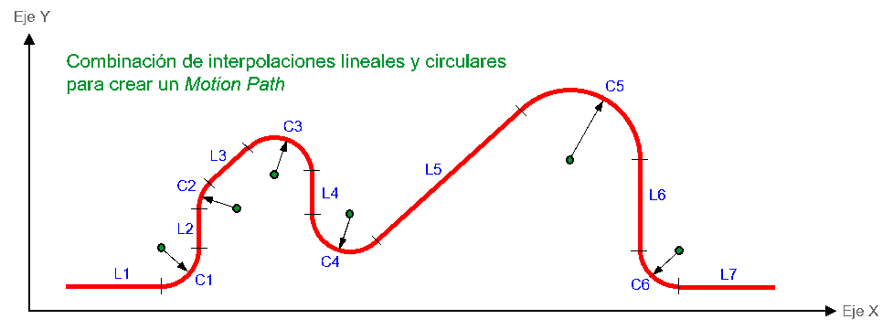 To achieve this, several linear and circular interpolation segments need to be programmed, in this example 13 segments are needed: L1, C1, L2, C2, L3, C3, L4, C4, L5, C5, L6, C6, and L7. Since it is necessary to know the next movement to maintain constant vectorial velocity, the PAC has a buffer to which the next interpolation must be “sent” before the previous one has ended. It should be noted that programming this motion path using CAM profiles would be very complex and inappropriate.