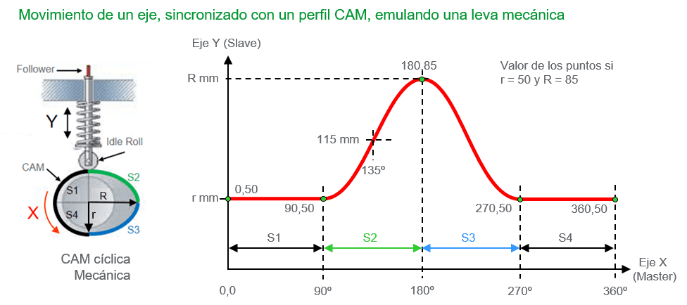 In this case, the CAM profile is “drawn” with the values of the five points (in green) that define the profile. Attached to the rotating axis of the cam is an encoder that provides the position of the X axis, or master axis, from 0 to 360 degrees. The X axis rotates through external means to the PAC control and the encoder provides the position value, in this case angular, with the encoder value, the PAC searches the CAM table for the corresponding position value of the Y axis (slave axis) and transmits it to the servo drive through the fieldbus, for example, when the master axis passes through 135 degrees, the reference position sent to the slave axis will be 115 mm (see graph). Therefore, the movement of the slave axis is completely dependent on the encoder position and the CAM profile values. Both the speed and acceleration will depend on the speed of the master axis (encoder), and the position of the slave axis will always be synchronized with that of the master axis, as if it were a mechanical cam.