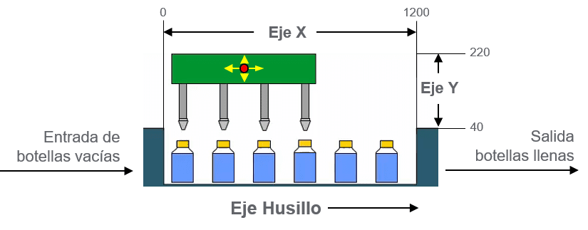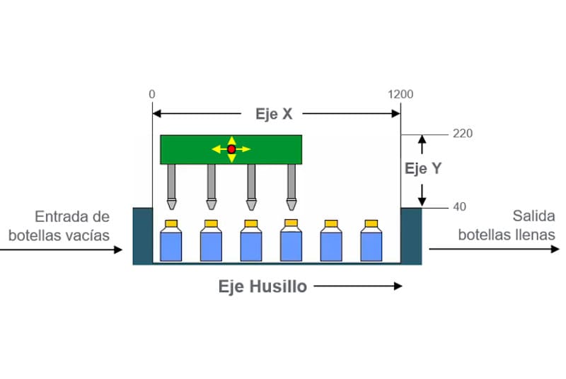 The bottles advance at a constant speed (according to the recipe value) driven by the spindle axis. The carriage (in green), which moves the filling nozzles, has two axes of movement, X and Y. The cycle starts with the carriage waiting in its left position and a few mm above the bottles. It synchronizes its movement with the spindle axis while lowering the Y axis and inserting the nozzles into the bottom of the bottles. As they advance, the X axis remains in synchronization with the spindle, the Y axis gradually rises, and the bottles are filled. Finally, it rises to the waiting position outside the bottles, and the X axis returns to the initial point waiting for the next cycle.