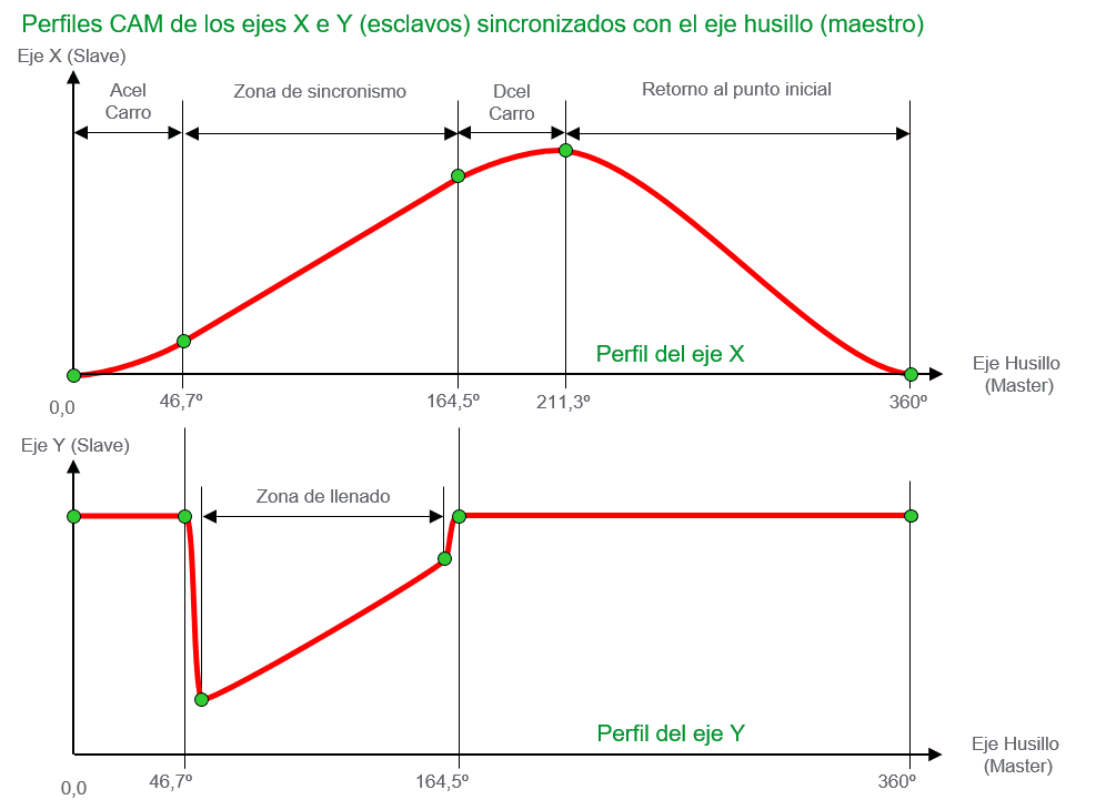 Once the carriage accelerates in X and synchronizes with the spindle, the Y axis can lower to the bottom of the bottle, and as the carriage advances, the nozzles rise until they come out of the bottle and remain in their waiting position. The carriage decelerates and quickly returns to the starting position for the next filling cycle. In these examples of CAM profiles, it is already evident that they cannot be solved by interpolating movements; it is necessary to synchronize the movement of each slave axis (Y, Y) with its master (spindle).