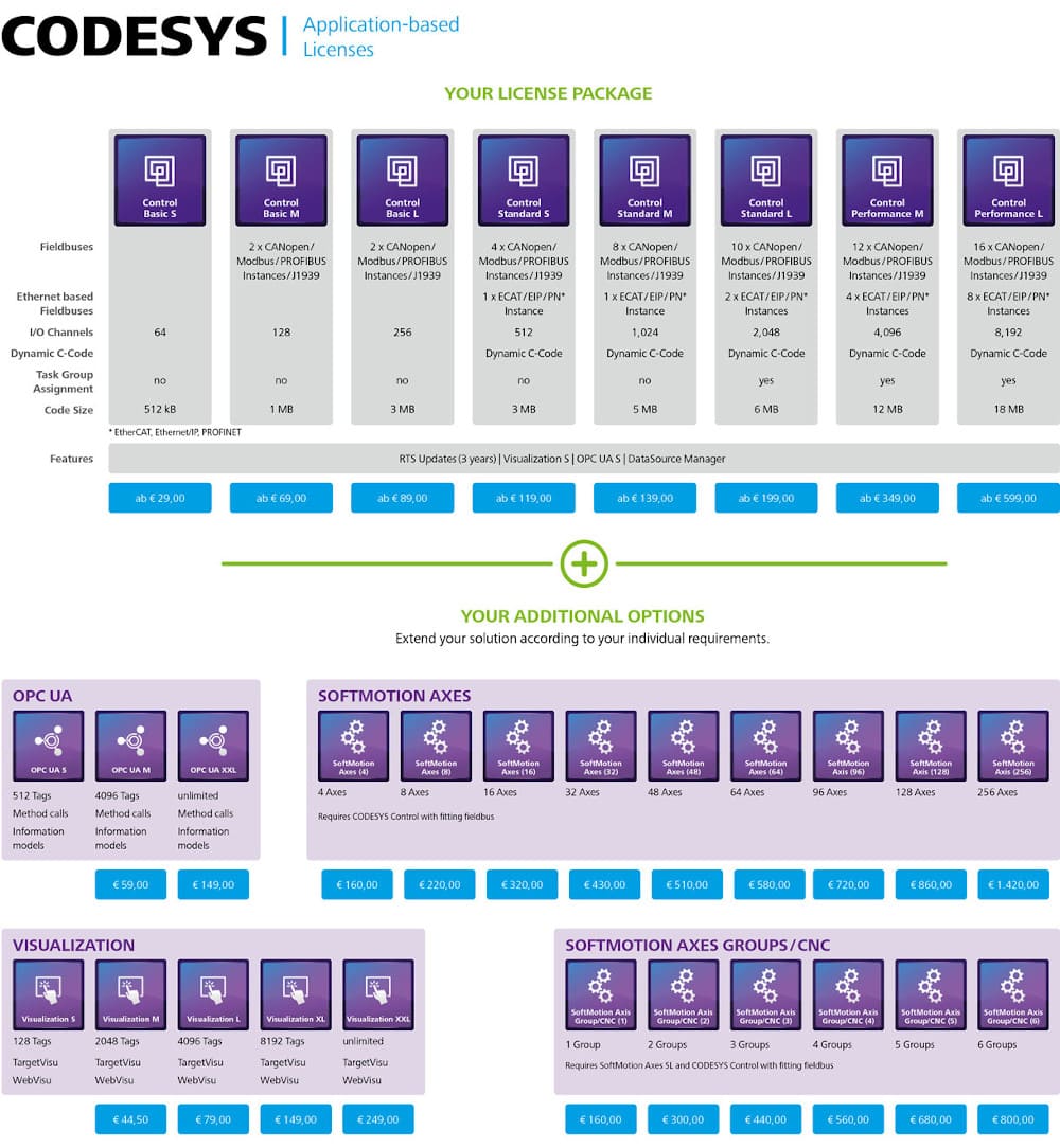 The CODESYS Development System provides all the data to select the appropriate license. This means that at any time you will only have to pay the price difference with the higher license. So it doesn’t matter in terms of price whether you buy a smaller license first and then upgrade, or whether you buy the larger license immediately.