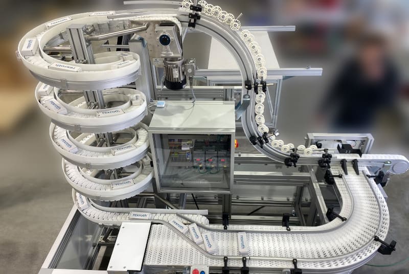 Bosch Rexroth will present the spiral transport system based on components of the VarioFlow chain conveyor system at interpack 2023: Hall 6, Booth A42