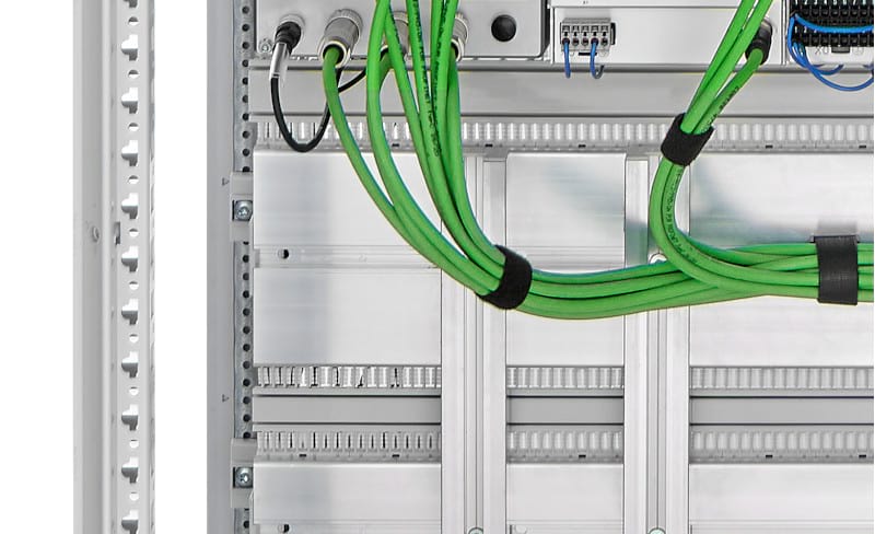The duct-free AirSTREAM wiring system enables the climate in the control cabinet to be improved so that the active cooling output can be minimized. In contrast to conventional control cabinet designs with mounting plates, the design is separated from the wiring level in the AirSTREAM and cable ducts that impair the flows are avoided. Permanent air circulation is generated between the warmer wiring front side and the cooler wiring rear side.