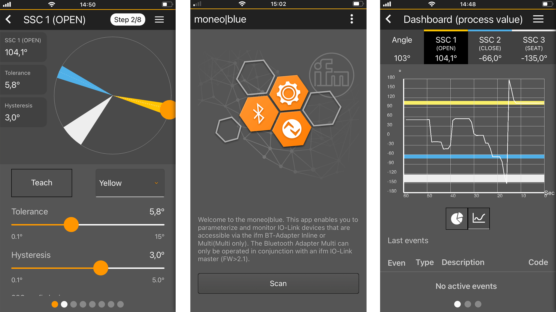With the Bluetooth adapter for IO-Link masters ifm offers a convenient way to read the data of the devices connected to the master and of the master itself and to adjust parameters. The process flow can be maintained by reacting to the situation without first leaving the plant and visiting the IT department. The password protection prevents unwanted tampering with the existing parameterisation.