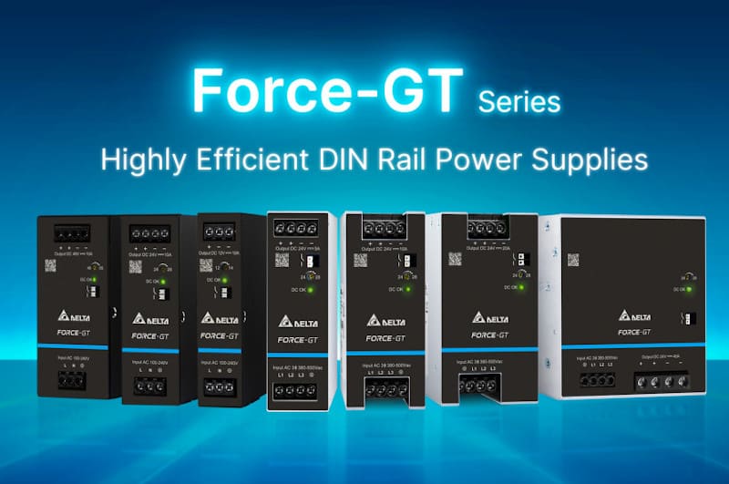 Delta launches new DIN Rail power supply Force-GT Series with single-phase and three-phase models. The Series features wide power range from 120 W to 960 W, high power efficiency of up to 95%, and an ultra-slim design. Two single-phase 480 W models of the Series have just been certified with 80 PLUS Platinum for 115 V Industrial, outcompeting other DIN rail power supplies.