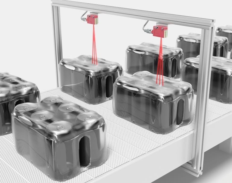 Multipacks are very convenient for the transport of beverage bottles or cans. But when it comes to packaging, the diversity of these multipacks can be a challenge for plant operators: The foil-wrapped containers may be metallic, colorful, or transparent. Or there may be holes in the film or cardboard somewhere. But the biggest difference between beverage containers is the shape and height. This makes reliable detection challenging.