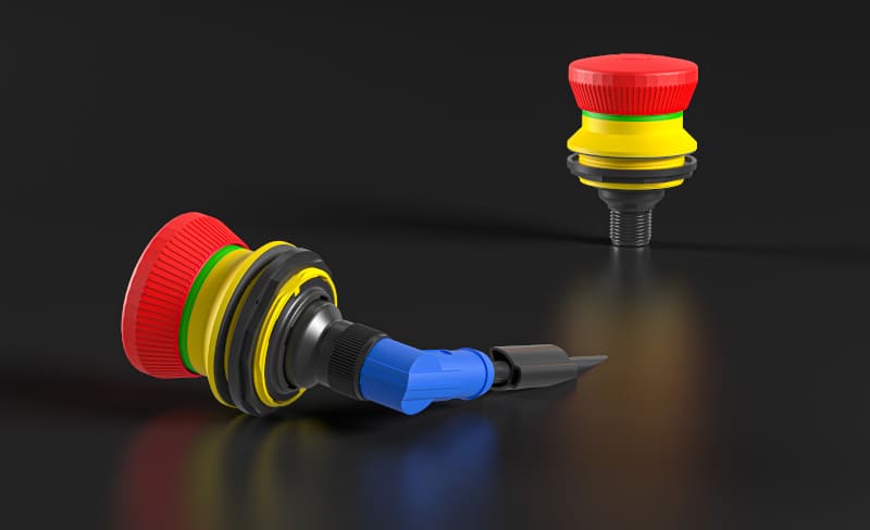 For most applications, 2 NC contacts and 1 NO are enough. For special applications requiring more than 2 NC contacts, the new e-stops KRVK4O with Faston terminals or KRVK4OP with PCB connection, each with 4 NC contacts, are the best choice.