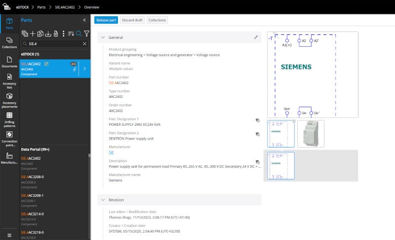 Now a few crucial innovations have been added: devices can be imported from the Eplan Data Portal into eStock. When making the first keystrokes for the entry, users see all devices in their own database in addition to all the relevant devices for the search in the Eplan Data Portal. Users can then open the desired device in the same window and, in case it hasn’t been already, import it with one or two clicks. When items are transferred from the Data Portal into Eplan eStock, the software initially created a draft version – meaning that previously approved device data isn’t automatically “overwritten” but the saving must instead be actively confirmed – i.e., accepted – by the user. Users can thus add data and/or make changes to the draft version before approving it and actually using the device in a project.
