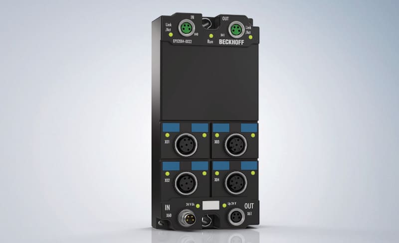 • The EPX3204-0022 EtherCAT Box module, which can operate temperature sensors (Pt100) in 2-, 3- and 4-wire technology as a 4-channel analog input. Linearization is performed across the entire, freely selectable temperature range. The terminal is set by default for Pt100 sensors in 4-wire technology. The EPX3204-0022 uses LEDs to indicate signal status and sensor faults (e.g. wire break).