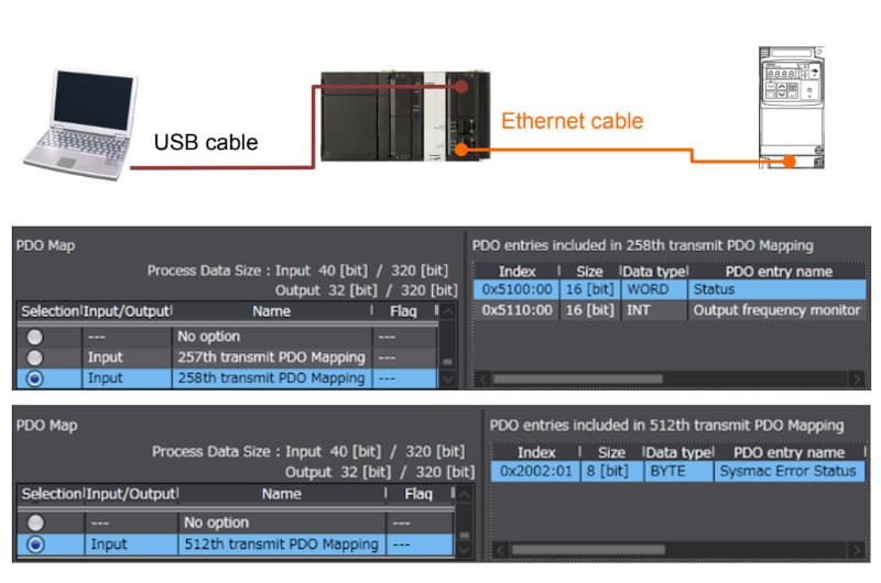 Refer to Section 6. EtherCAT Settings and Section 7. EtherCAT Connection Procedure to understand the setting method and key points to operate PDO Communications via EtherCAT. In this document, the operations for PDO communications via EtherCAT are checked by the output frequency setting and the status check of Inverter.
