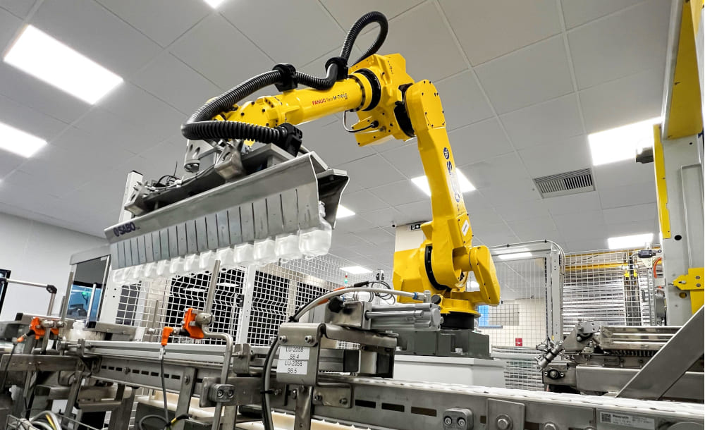 A particular highlight at interpack is FANUC’s presentation of a software feature that enables its CRX cobot to handle payloads of up to 40 kg. This capability not only allows the cobot to lift heavier products, but also helps increase throughput – for example, by picking multiple cartons in a single cycle – while maintaining safe, space-saving operation.