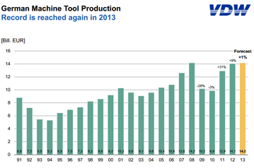 Following two years of substantial growth, the German machine tool industry expects a modest increase in production output of 1 per cent during 2013. “This means the sector will be back to its previous high from 2008”, reports Martin Kapp, Chairman of the VDW (German Machine Tool Builders’ Association), speaking at the organisation’s annual press conference in Frankfurt am Main.