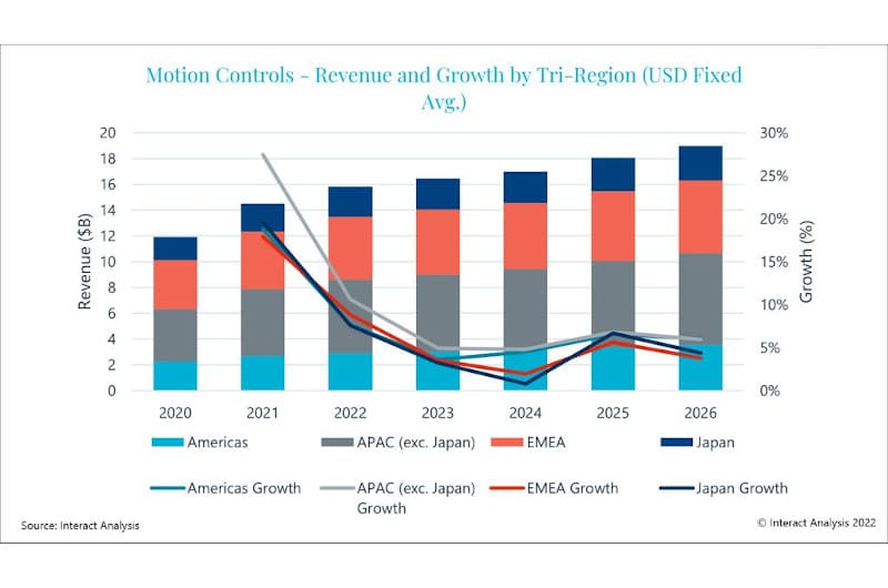 New research from Interact Analysis shows that strong 2021 growth in the motion controls market will be followed up with 9.1% growth in 2022. This growth will continue out to 2026, but at a slower pace with a CAGR of 5.5%. Meanwhile, global supply chain shortages, particularly issues in the semiconductor market and raw material costs, have resulted in major price increases from motion control suppliers.