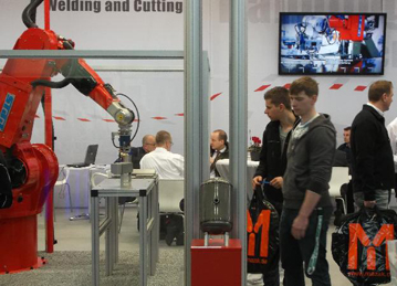 Reis presented robots for performing multi process solutions on this fair. Thus one single robot links a CMT welding station, stationary spot welding tongs as well as a gluing station.