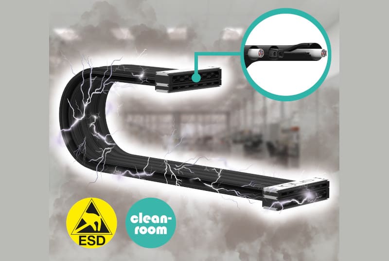 igus has added an ESD variant specifically for highly sensitive cleanrooms to its e-skin flat series. The modular ribbon cable’s new material prevents the chain from becoming electrostatically charged while ensuring that it generates no particles, even during very fast movements. The modular design with individual pods also allows quick energy supply system filling.