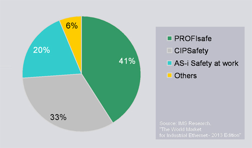 The development of PROFIsafe has proven to be especially positive. With an increase of newly installed nodes in the field of 50%, one in ten new PROFIBUS or PROFINET devices is currently equipped with PROFIsafe. According to IMS, the market share of PROFIsafe is 41%. This places PROFIsafe clearly in the number 1 spot among safety-related communication profiles.