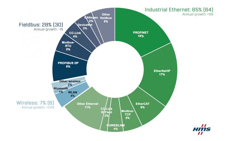 Wireless continues to grow rapidly at a rate of 24%. Wireless now has 7% market share but the market still awaits the full impact of 5G in factories. With ongoing global activities about wireless cellular technologies as enablers for next level smart manufacturing, HMS expects that market demand will increase for wirelessly connected devices and machines to be included in the less cabled and flexible automation architectures of the future.