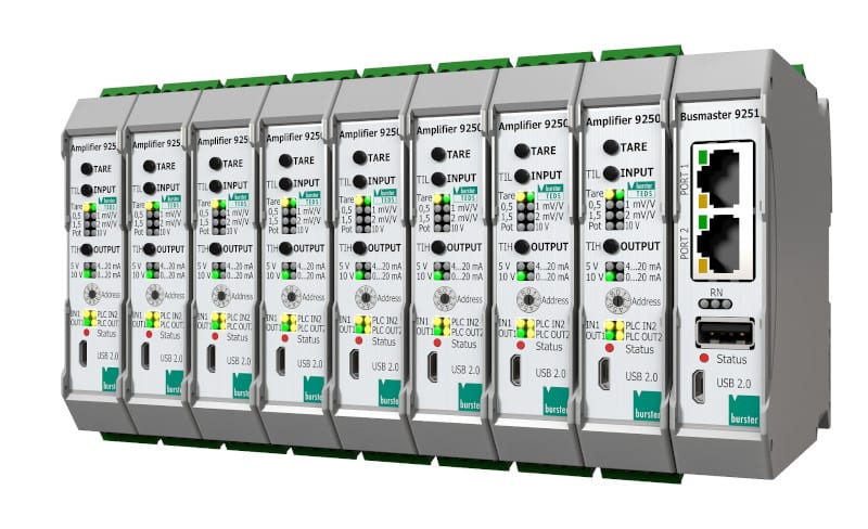 Burster’s 9251 Ethernet fieldbus controller and 9250 instrumentation amplifier systems enable the flexibility to mix the customer’s preferred strain gauge, potentiometer, voltage or TTL sensor technologies. With rapid sensor set-up using Burster’s TEDS push-button auto-sensing facility, this extends to a manufacturer-independent choice that allows the integration of sensor data for complete machines and systems where high precision and real-time measurement of torque, force, vibration, pressure, etc., is required for extensive condition monitoring and preventative maintenance purposes – a pre-requisite of Industry 4.0.