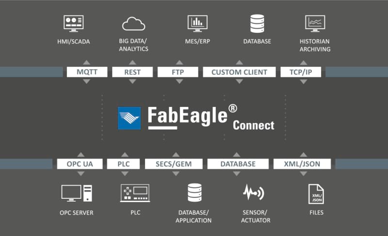 FabEagle®connect is a software for interface integration and can be used quickly and flexibly for both existing and new systems. It enables machine builders and factory operators to create fast and reliable connectivity for their Industry 4.0 and IoT applications in the manufacturing and IT environment. The modular and configurable structure of FabEagle®connect offers a variety of ready-made functions and interfaces for manufacturing and IT.