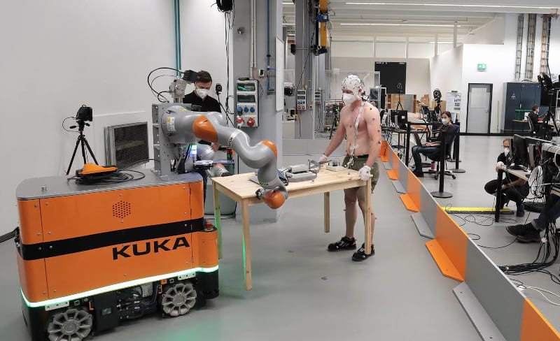 The system was tested at the KUKA plant in Augsburg by 15 test persons. Each day, the test persons aged between 18 and 49 answered questions and performed tasks with the HRC system. One such task was to carry a table – sometimes with another person and sometimes with the robot. “When carrying with the robot, it was clear that the human was in control and that the robot only did what it was supposed to. In this way, it was possible to avoid communication difficulties,” said one of the test persons after his task. “Altogether, communication was unambiguous. Particularly since one received clear instructions via the tablet.”