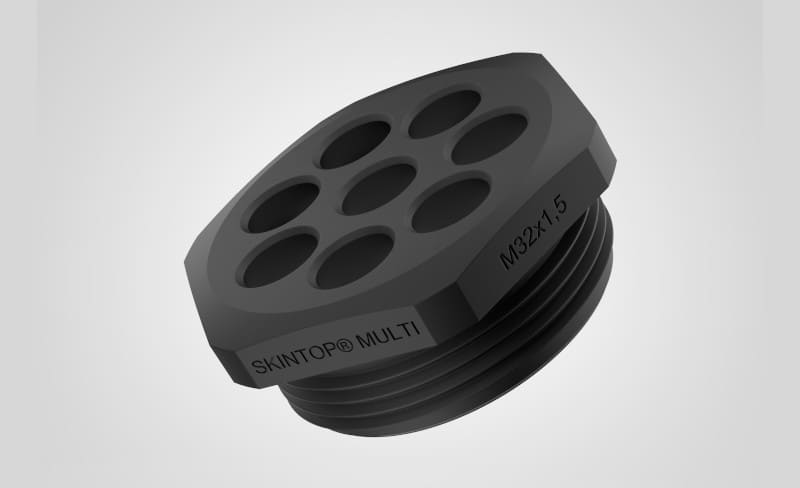 The patented funnel design at entry points in combination with innovative gel based material allows the maximum clamping ranges to be increased with up to 4 mm variance per cable diameter. This flexibility in selecting the cable diameter reduces the variety of parts in the warehouse, thus generating logistical and financial benefits. It enables the customer to insert a variety of cables or hoses in a tight space. Unused entry points remain securely sealed thanks to the elastic gel technology with innovative membrane technology. Here the gel material ensures optimum strain relief on the entire cable bundle. There are also time benefits for installation. As no additional preparatory work is required for rectangular and round multi-cable bushings, such as pre-piercing, to install the cables, several work steps are omitted. The SKINTOP® MULTI-M can be mounted to the housing very easily by screwing in or fastening with a lock nut.