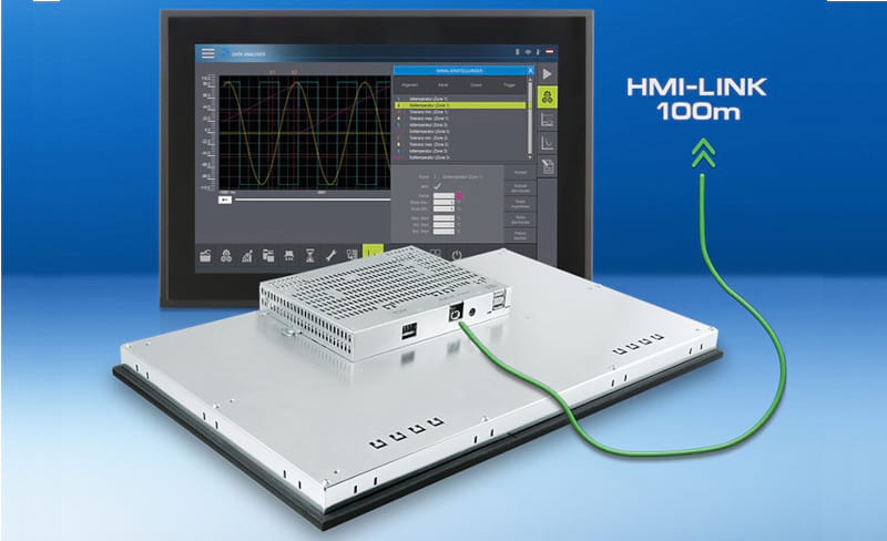 The HMI-Link technology is completely hardware based and independent of the operating system used. With a standard CAT5e or CAT6 Ethernet cable, video signals (full HD) and USB 2.0 data can be transmitted between the remote operating unit and the PC or HMI-Link device without loss.