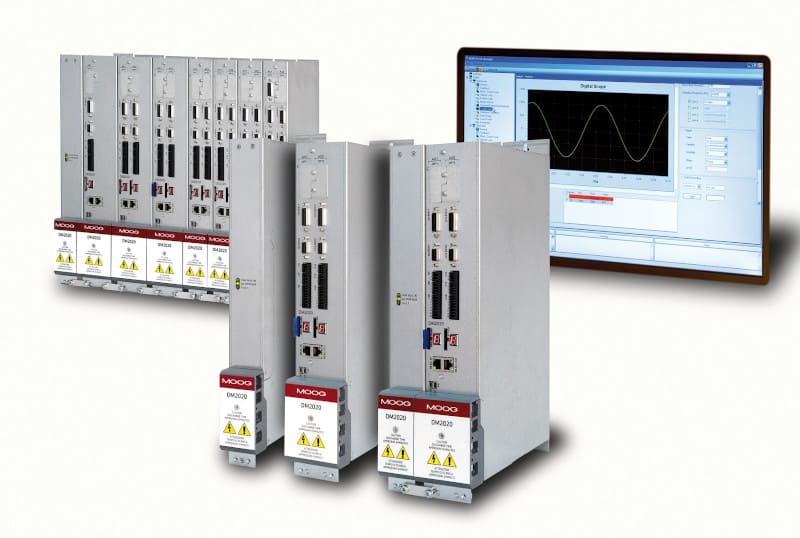 Moog’s development team has integrated its electromechanical solutions into the design of the Salvagnini robot so that the system is able to connect various processes, including transporting the current workpiece from one station to the next. To develop the multi-axis solution, Salvagnini engineers chose the DE2020 energy management module, the DI2020 motor with integrated electronics, the DR2020 decentralized single-axis drive and the HD/FAS H servo motors from Moog.