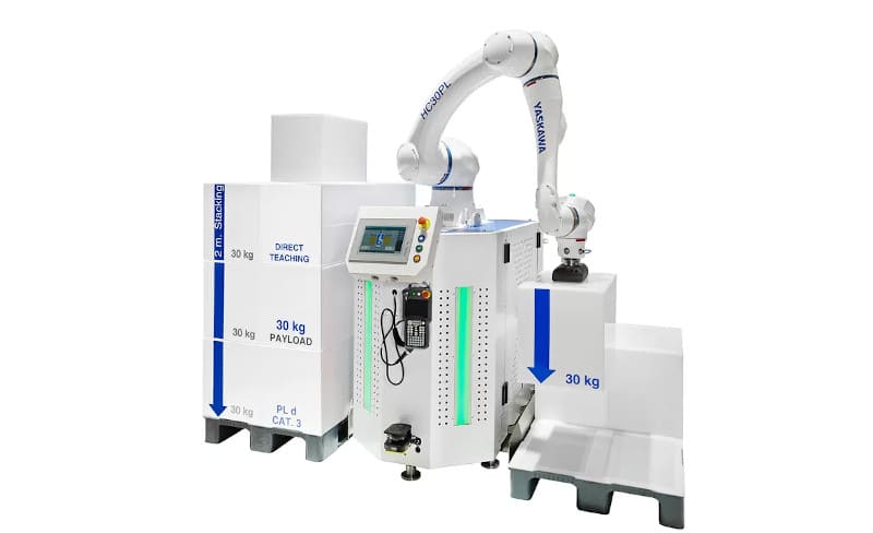 Yaskawa has already successfully implemented numerous cobot palletizing applications with its predecessor model, the HC20DTP. Now the manufacturer is expanding its portfolio by introducing a special cobot palletizer: the HC30PL. With an even higher maximum payload of 30 kg, it can be used in heavy order picking applications in warehouses (palletizing and depalletizing), which are highly strenuous, monotonous, and unergonomic.