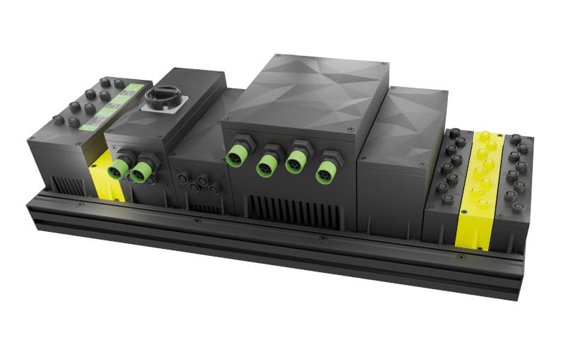 At the heart of Vario-X are robust, IP67 rated waterproof and dustproof modules, which include power supplies, controls, disconnect switches, safety technology and I/O connections. They can be easily assembled side by side on a rugged backplane with integrated mechanical mounting profiles. Once assembled, the Vario-X solution can be easily attached to all common mounting systems without further protection and, in extreme cases, is rugged enough to be stepped on without damage. Equipped with a multicore CPU, Vario-X can meet all control requirements and be easily integrated into all higher-level Industrial Ethernet networks as an open control platform.