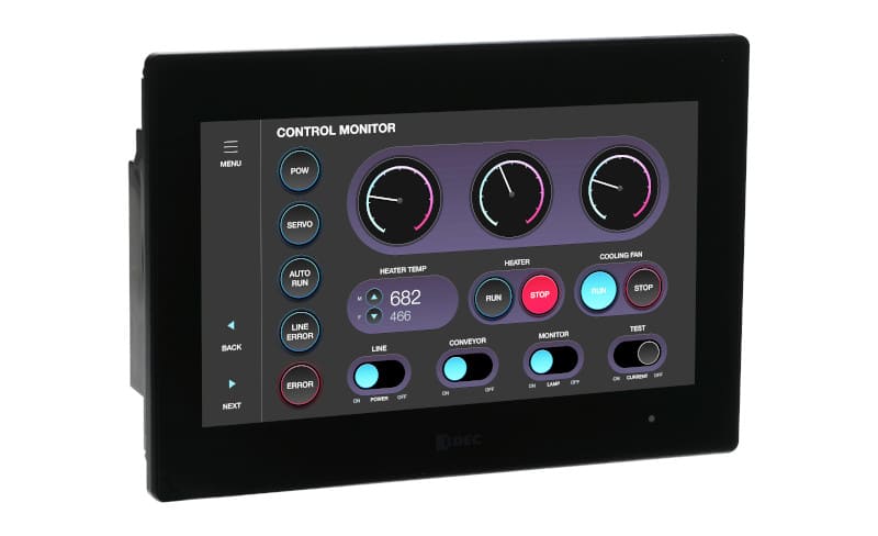 All PLC and HMI configuration is accessed through IDEC’s standard WindOI-NV4 software, which is easy-to-use and intuitive, with a drag-and-drop interface and extensive image library. Projects can automatically be converted from one HMI size to another within seconds. Script programming, PIDD loop control, multilingual capabilities, security, trend charts, data logs, alarm logs, and other functions and features are supported for both the HMI and the PLC.