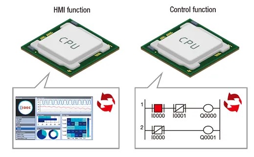 An all-in-one PLC+HMI is compact and consumes far less panel space than separate units. Because the PLC and HMI are internally connected, require only one power supply, and share the same network connection, installation is simplified.