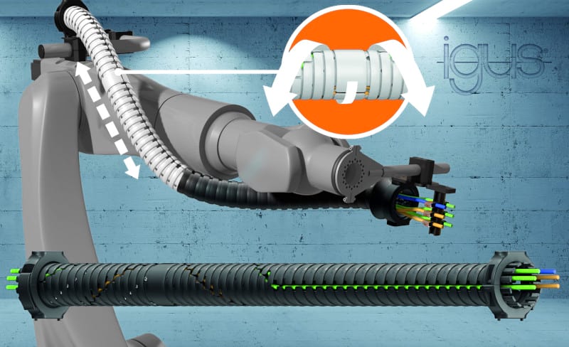 The three-dimensional triflex R energy chains from igus are widely used in the industry for fail-safe guidance of cables and hoses on robots. Retraction systems have so far been used on the third axis to ensure that no loops are created during the movement of the energy chain system which could hinder the robot. “However, the axes on the robots offer less and less space, so a new solution was needed”, says Jörg Ottersbach, Head of the e-chains Business Unit at igus GmbH. No sooner said than done, the triflex TRX system was developed based on the triflex R energy chain.