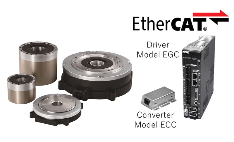 NSK will release an “EtherCAT compatible driver” (“Driver Model EGC” and “Converter Model ECC”) as a device to drive and control NSK’s high-precision positioning and transport device “Megatorque Motor”. The introduction of this product enables integrated control of multiple motors, high-speed synchronous operation, and finer rotation positioning while maintaining the high environmental resistance of the Megatorque Motor.