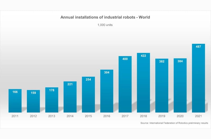 The North American robotics market experienced its best quarter ever to begin the year: Companies from the US, Canada and Mexico ordered 11,595 industrial robots – up 28% compared to the first quarter of 2021. Revenue rose by 43% and reached a value of USD 664 million. These results are in line with a positive trend worldwide: Preliminary data for 2021 show, that 486,700 industrial robots have been installed globally (+27% year-on-year)