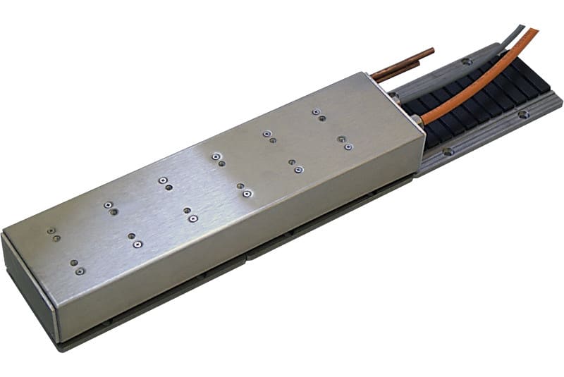 LMX linear motors comprise a metal track with multiple embedded rare earth magnets, and a coil assembly supported by a customer-supplied guideway. A key feature of the motors is that they are designed to operate with a comparatively large air gap of 1 mm, to reduce the impact of mounting tolerances on performance characteristics. For most machine tool applications, the track is held stationary and the coil assembly is free to move – but converse mounting arrangements are also practicable, with similar performance attributes.