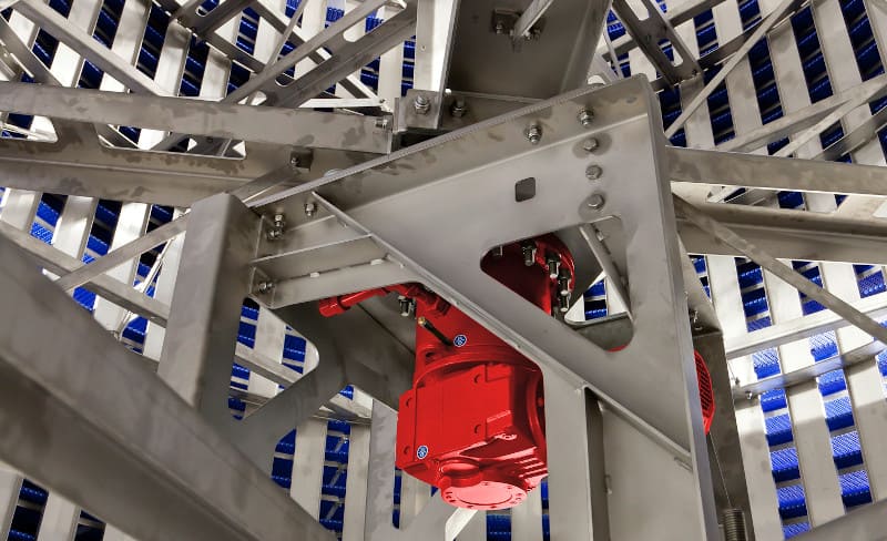 Heinen Freezing uses large series P industrial planetary gear units in spiral systems for continuous pasteurization, proofing, cooling or freezing. The most important property is the combination of extremely high torque and compact installation dimensions. The wide temperature range that the gear units are exposed to presents another particular challenge. This range extends from -35 °C during operation to +40 °C during the cleaning of the spiral freezers.