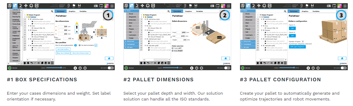 With regards to programming, Robotiq again hits the mark with its unmatched, user friendly and intuitive software, that actually requires ZERO programming. The solution features a visual interface and built-in modules that make setup simple, guiding the user through a sequence of easy steps. This optimization is the direct result of creating a standardized solution for palletizing applications.