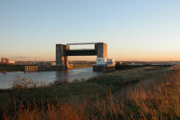 Two concrete towers stand 20 meters above the ground on either side of the mouth of Dartford Creek. This is the UK Environment Agency’s Dartford Barrier Flood Defense System in Kent, England. The barrier is routinely closed, in conjunction with the bigger Thames Barrier upstream, to prevent high tide water levels in the River Thames Estuary flowing back up the creek and flooding Dartford and the surrounding area.