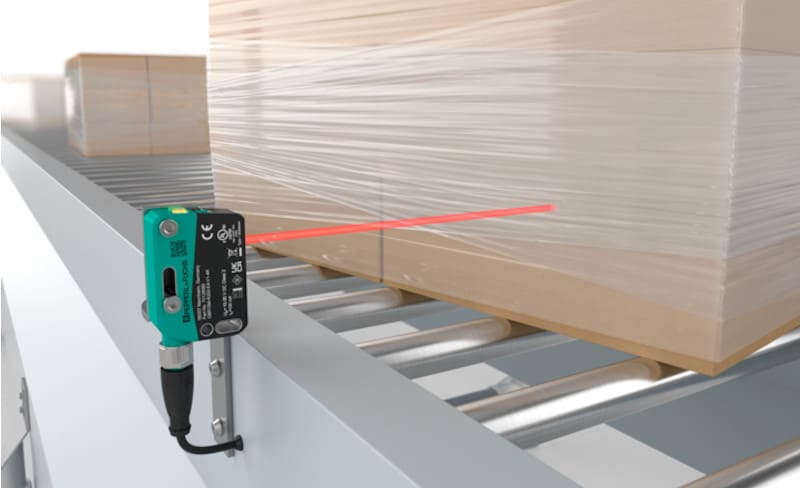 The R202 series was developed with the special requirements of the material handling industry in mind. In pallet conveyor technology, for example, foil-wrapped pallets often have to be detected. With their reflective surfaces, they represent a challenge for the sensor technology used. The retroreflective sensor for clear-object detection was designed for such demanding tasks: It operates without dead band and is optimized for detecting shiny, reflective objects.