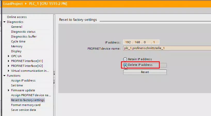 To reset the IP address of a Siemens S7-1200 or S7-1500 PLC, you can use the “Reset to factory settings” function in STEP 7 (TIA Portal). The IP address of your S7-1200/S7-1500 CPU must be identical to the IP address used in your STEP 7 (TIA Portal) project. Otherwise, no online connection is possible.