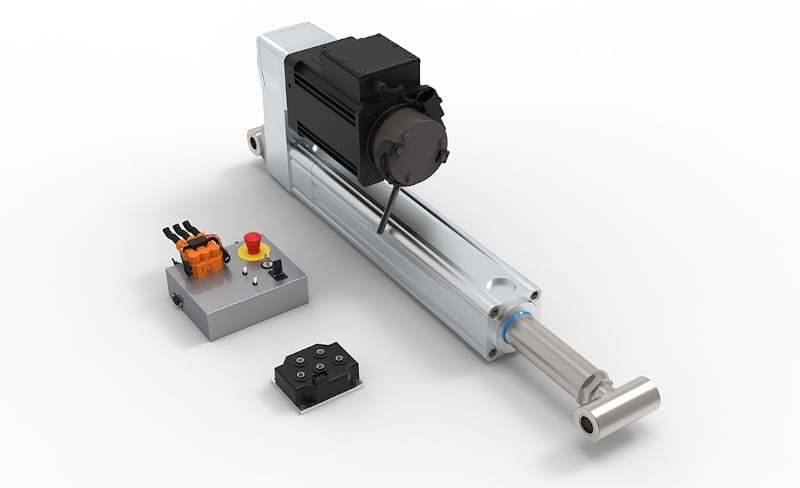 Another innovative system solution is the e-MOVEKIT from Ewellix. This system ensures a fast and easy implementation of an electric actuator to replace a hydraulic cylinder. The e-MOVEKIT combines a CASM-100 actuator adapted to the application and includes motor, gearbox and mounting attachments with a controller featuring an analog and CAN bus interface. The actuator controller enables a “speed mode”, where the linear speed of the actuator is increased or reduced as it moves. To do this, it adapts the power consumption and torque of the motor to the respective control commands. Two versions of this controller are available as part of the e-MOVEKIT: one version as a solution for conventional system integration and another as a quick-start variant for conceptual design studies.