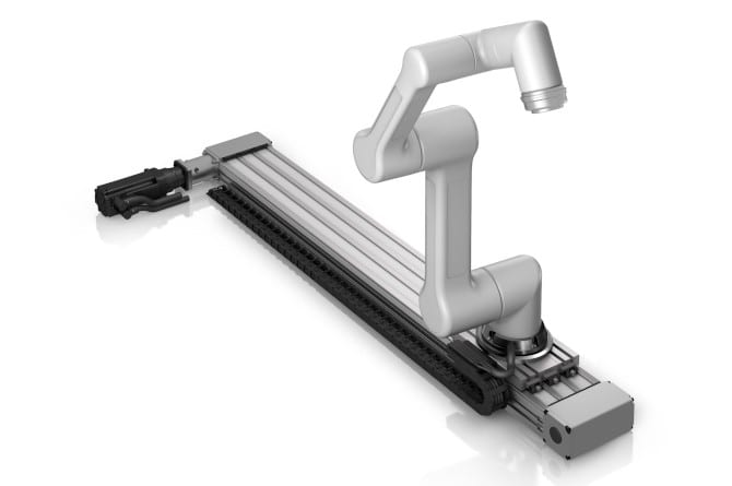 With the seventh axis of the robot, it is possible to expand existing working ranges and therefore fully automate new production areas. For this, Schaeffler offers MDKUVE-series plug-and-play-ready linear axes with a servo gear motor, cable track solution, a floor or ceiling installation kit and an adapter plate for the robot. The range extender software can easily be fully integrated into the customer’s robot control system.