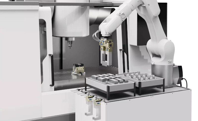 Up to now, automated changing has only been possible by replacing the entire gripper. The BSWS-R accomplishes this task with minimal use of components: all that is needed for each gripper finger is a jaw quick-change base, two adapter pins and a storage station. The base is screwed to the workpiece-specific gripper finger and the adapter pins are attached to the base jaw of the gripper. When the base moves into the storage station, the locking pin is actuated, and the form-fit locking mechanism is unlocked. The robot moves upwards out of the jaw quick-change system, and the fingers and the base remain in the storage station. No additional effort is required as the robot performs the change with its own force. The new system design eliminates the need to drill through the finger, and only threaded holes are required. This gives users even more freedom when designing their fingers.
