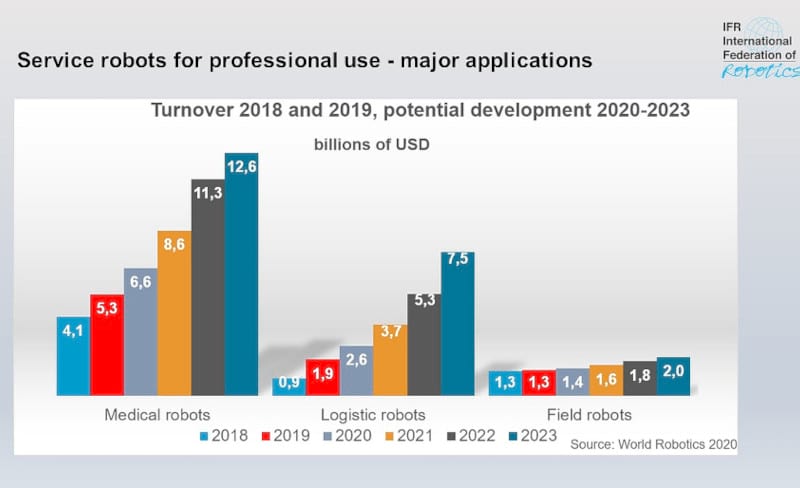 Sales value of professional service robots increased by 32% to USD11.2 billion worldwide (2018-2019). The COVID-19 pandemic will further boost the market. High demand for robotics disinfection solutions, robotic logistics solutions in factories and warehouses or robots for home delivery are examples of this trend.