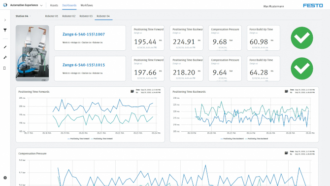 The system specialists at Festo have added software to the existing system PCs of the robot cell that collects the welding gun’s diagnostic data and sends it to a collection point in the cloud. Running in the cloud is a maintenance application that, as well as visualising the data in the browser (maintenance dashboards), also evaluates it with respect to the expected service life.