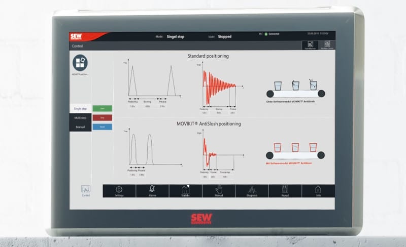 The MOVIKIT® AntiSlosh software module from SEW EURODRIVE uses intelligent coordination technology to create optimum motion profiles adapted to a liquid’s physical properties. Calculating the ideal cycle time enables production with maximum performance, combined with spillage protection.